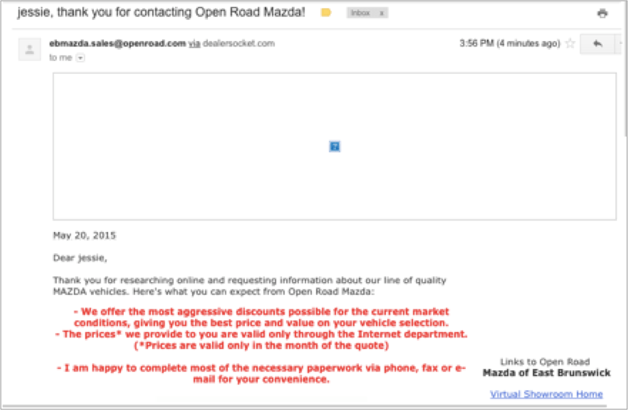 You can see how helpful this was. My inquiry was for a specific make and model with specific lease terms and questions about availability. I got an ad for Mazda.
