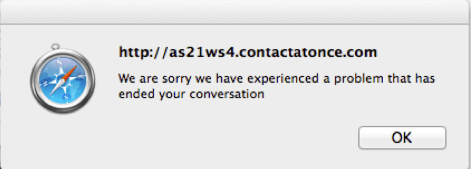 On a national dealer site, there was a click-to-chat window, branded with a specific person’s name who was ready to help me right now. When I clicked it…I got an error message that ‘ended’ the conversation.