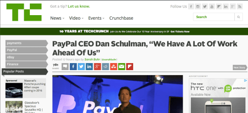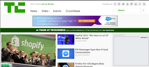 Let’s take a look at TechCrunch. In this case, we have an image that relates specifically to the story (vs. Fast Co’s more esoteric images), and 2+ story leads above the scroll. This may be less dramatic visually- but it gets me to the stories.